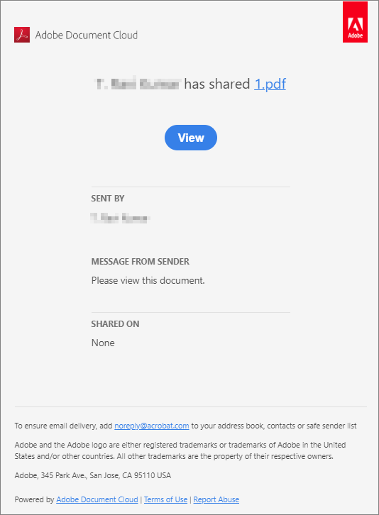 Możesz udostępnić łącze do dokumentu PDF innym osobom do wyświetlania lub komentowania. Udostępniony dokument otwiera się na dowolnym urządzeniu i jest bezpiecznie przechowywany w chmurze Adobe. Odbiorcy otrzymują wiadomość e-mail z łączem umożliwiającym przeglądanie i komentowanie dokumentu w przeglądarce bez logowania.