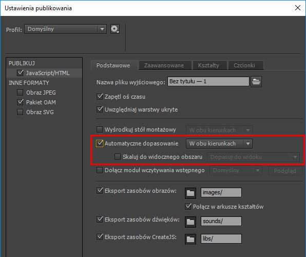 Na zakładce Podstawowe zaznacz pole wyboru Automatyczne dopasowanie. Gwarantuje to, że animacja reaguje w odniesieniu do szerokości, wysokości lub obu wymiarów. Zmienia rozmiar opublikowanych danych wyjściowych na podstawie rozdzielczości ekranu. Wynikiem działania tej opcji są aktywne, ostre i czytelne dane wyjściowe zgodne z wyświetlaczami o wysokich rozdzielczościach.