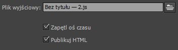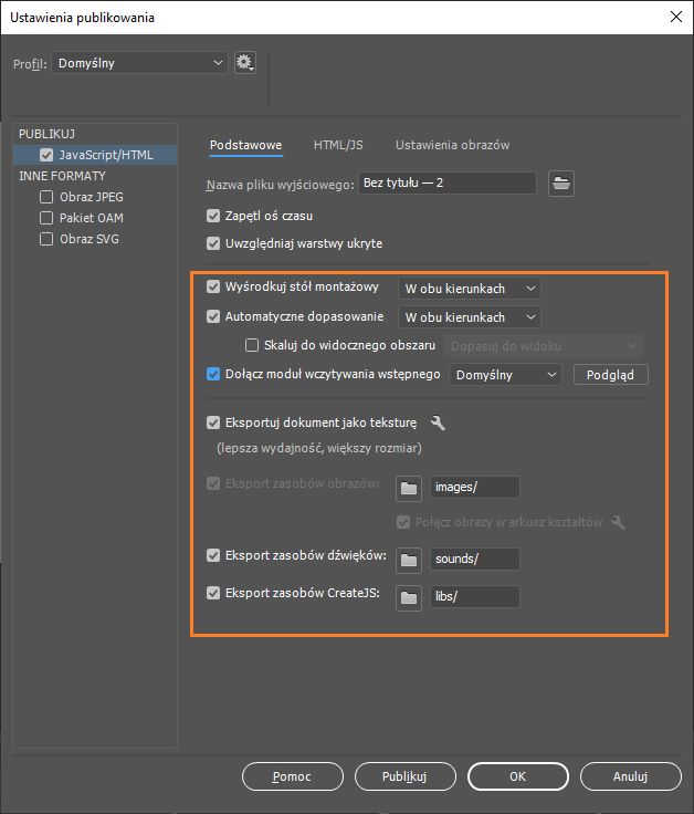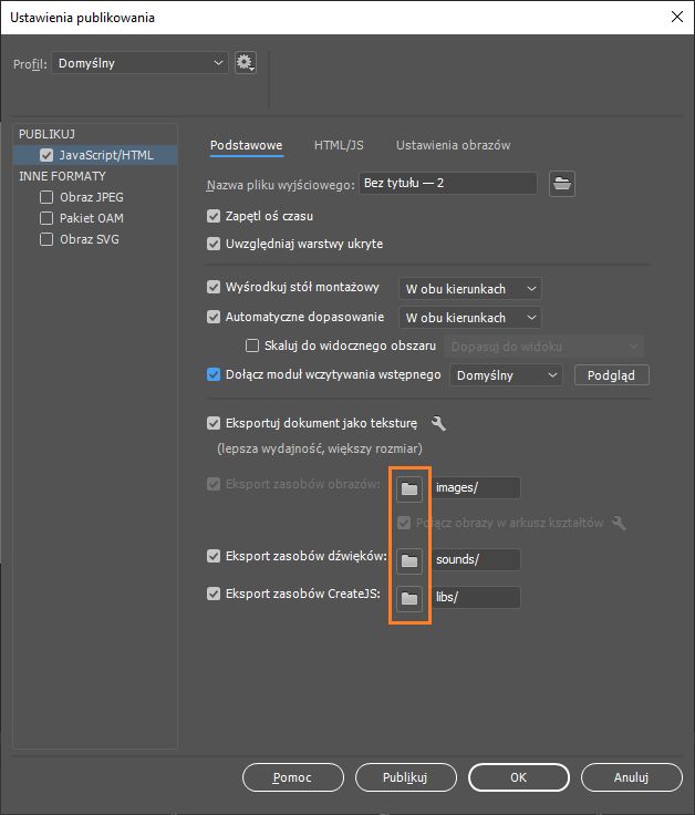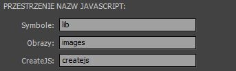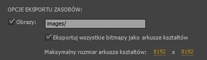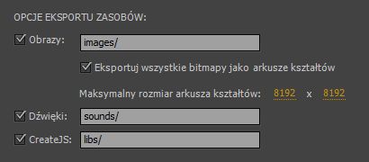 - Wykluczenie z eksportu zasobów pliku FLA przez wyłączenie eksportu zasobów obrazów, dźwięków i bibliotek pomocniczych JavaScript CreateJS oraz wykonanie eksportu za pomocą względnych adresów URL
