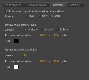- Eksportowanie bitmap jako arkusza kształtów przy użyciu opcji z zakładki Arkusz kształtów w ustawieniach publikowania