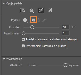 Suwak Rozmiar pozwala ustawić żądany rozmiar pędzla. Obok suwaka znajdują się podgląd i pole edycji wartości rozmiaru pędzla.