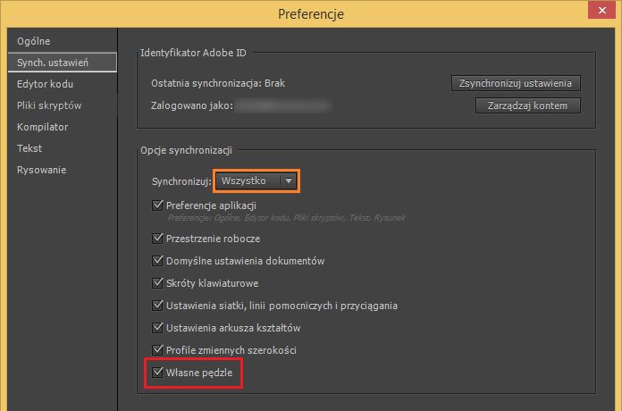 Własne pędzle można synchronizować z chmurą za pośrednictwem preferencji programu Animate. Aby to zrobić, wybierz opcję Edycja > Preferencje (Windows) lub Animate > Preferencje (macOS). Poniżej przedstawiono opcję synchronizacji pędzli w sekcji Synchronizacja ustawień: