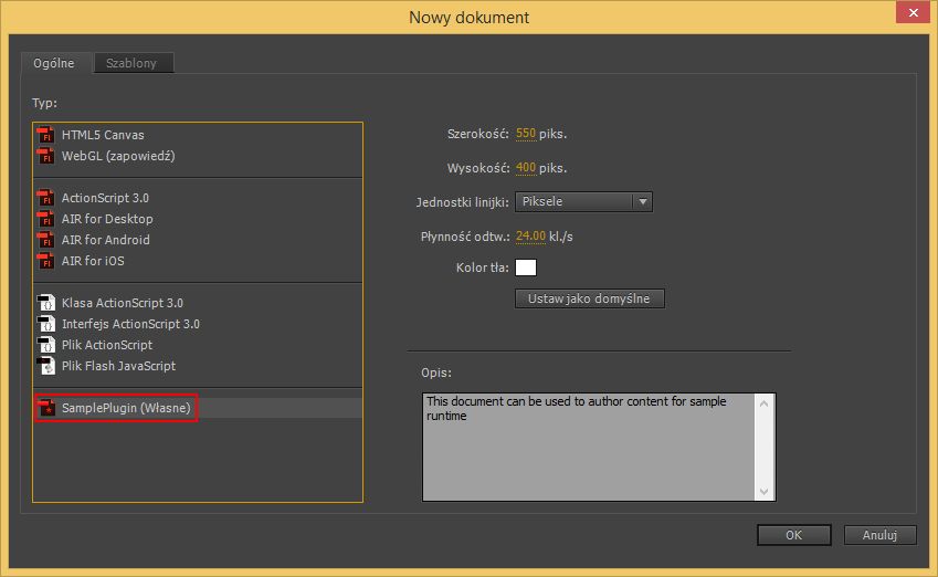2. W oknie dialogowym Nowy dokument wybierz profil konwersji spośród zakładek u góry ekranu, na przykład Animacja postaci, Sieci społecznościowe, Gra, Edukacja, Reklamy, Strony internetowe i Zaawansowane. Wybierz typ nowego dokumentu dodany przez wtyczkę platformy niestandardowej, a następnie kliknij przycisk OK. Będą widoczne następujące zmiany: