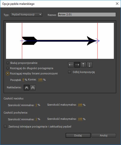 Ikona Edytuj pędzel pozwala otworzyć okno edytowania dla wybranego pędzla. Jeśli do edycji jest wybrany pędzel kompozycji, wyświetlane jest okno dialogowe Opcje pędzla kompozycji. Można modyfikować właściwości takie jak kierunek, preferencje skalowania czy opcja nakładania pędzla, stosując zmiany do istniejących pociągnięć.