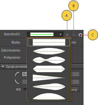 Możliwość zapisania profilu szerokości jest dostępna wyłącznie po zaznaczeniu na stole montażowym zmiennej szerokości, a nie tylko domyślnych profilów szerokości. Za pomocą narzędzia Szerokość można tworzyć własne profile pociągnięć i zapisywać je. Analogicznie ikona usunięcia profilu szerokości jest dostępna, gdy na liście rozwijanej zaznaczono własny profil szerokości. Ta opcja pozwala usunąć własny profil.