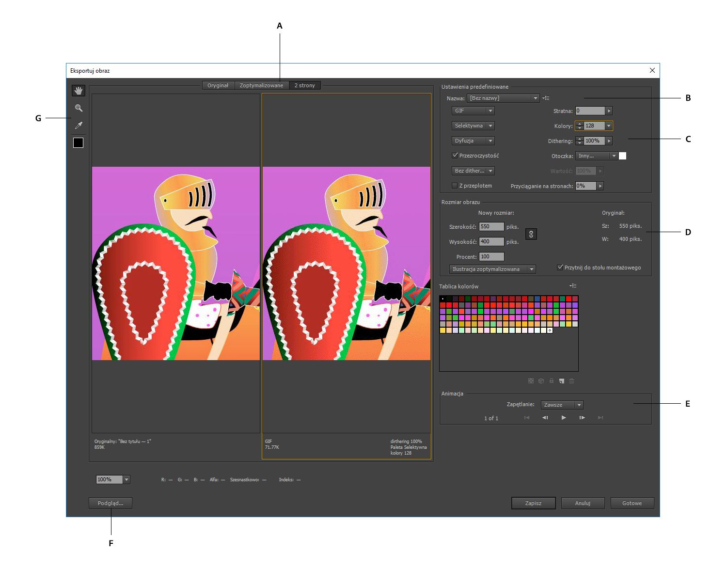 A. Opcje wyświetlania B. Menu podręczne Optymalizuj C. Opcje predefiniowane D. Opcje rozmiaru obrazu E. Opcje animacji F. Podgląd G. Paski narzędzi