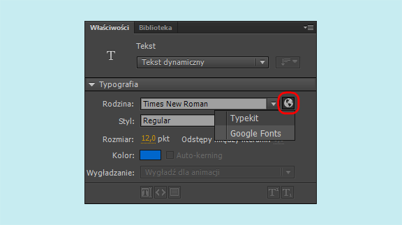 Kiedy podczas tworzenia i publikowania materiałów internetowych są stosowane czcionki lokalne, ich wygląd u klientów nie jest optymalny. W programie Animate wprowadzono dostęp do czcionek Google Fonts, które oferują spójną typografię na każdym ekranie. Czcionki Google Fonts są udostępniane z licencją open source i pobierane z serwerów firmy Google. Więcej informacji o czcionkach Google Fonts i ich twórcach można znaleźć na stronach https://fonts.google.com/about i https://fonts.google.com/attribution.