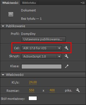 - Otwórz istniejący lub utwórz dokument AIR for iOS w programie Animate.