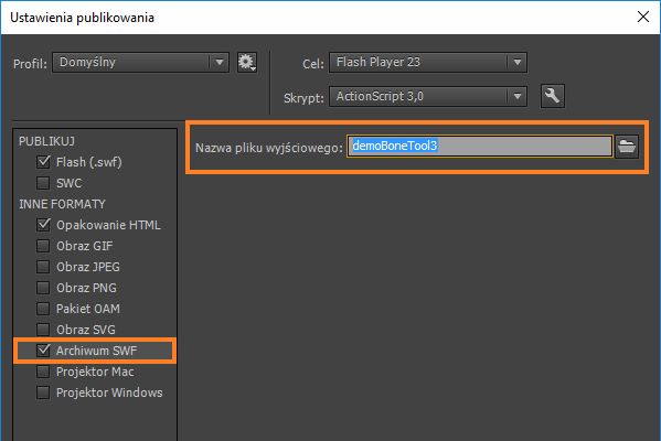 W dokumencie ActionScript wybierz opcję Plik > Ustawienia publikowania > Inne formaty > Archiwum SWF.