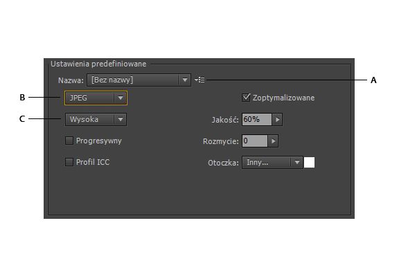 Wskazuje wstępnie skonfigurowany zestaw opcji, którego chcesz użyć przy eksportowaniu. Nowe ustawienia predefiniowane można tworzyć, ustawiając odpowiednio opcje i wybierając polecenie Zapisz ustawienia z menu panelu. (Aby otworzyć menu panelu, kliknij trójkąt po prawej stronie menu Ustawienia predefiniowane).