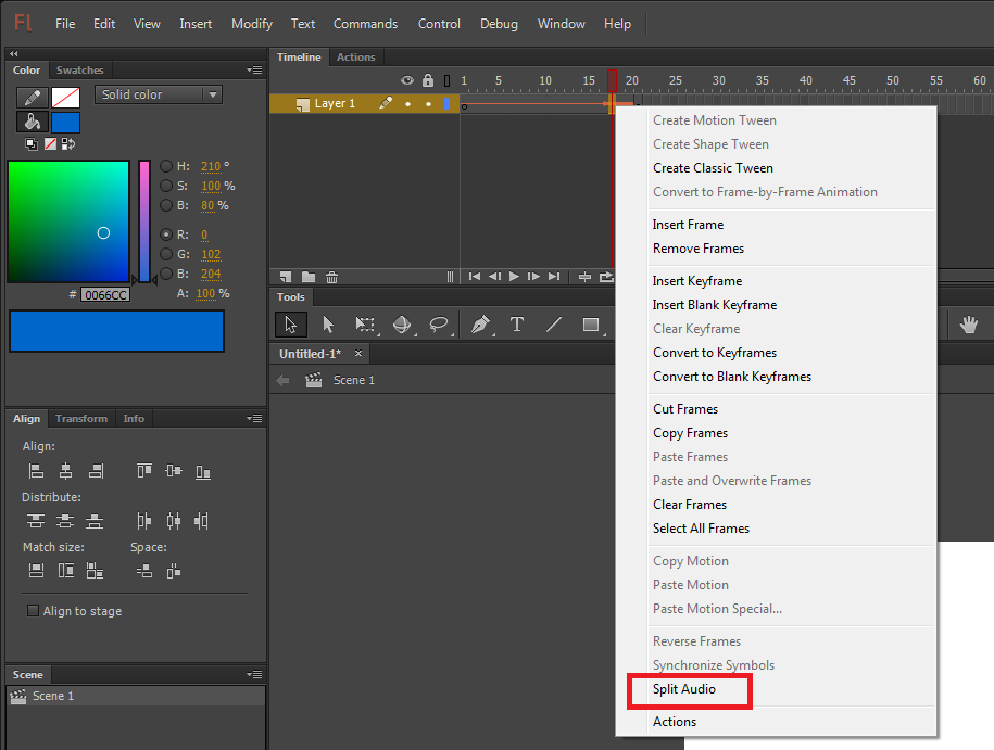 Program Animate usunie dźwięk z warstwy osi czasu.