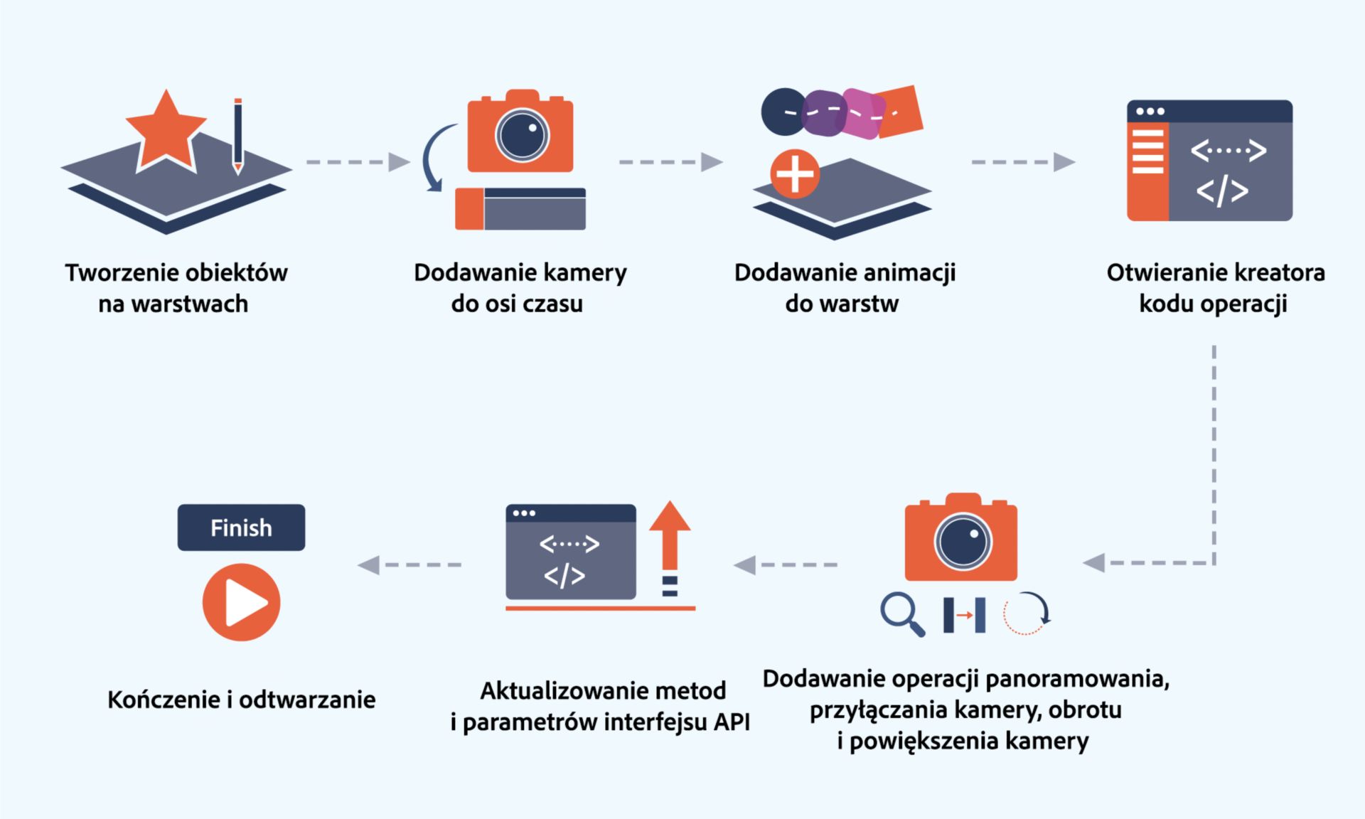 Na poniższym schemacie przedstawiono poszczególne kroki tworzenia animacji przy użyciu kamery interaktywnej. Kreatora kodu operacji można używać w dokumentach HTML Canvas.