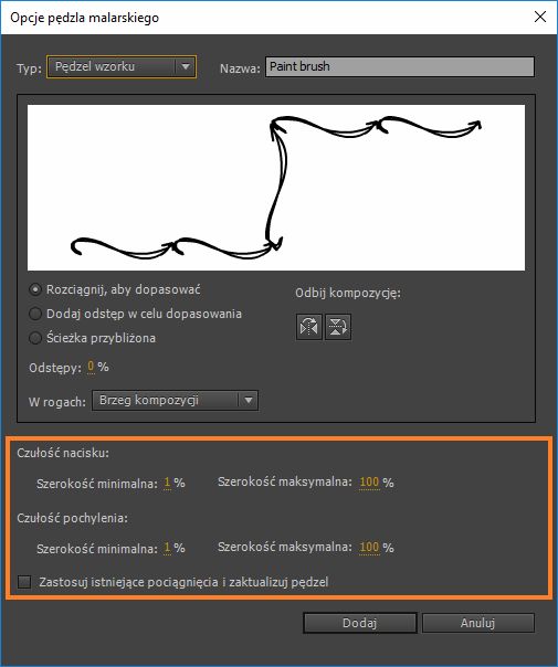 - Rozciągaj do długości pociągnięcia: pozwala rozciągnąć pędzel na długość rysowanego pociągnięcia.