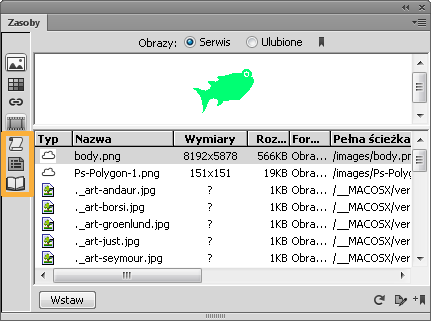 Panel Zasoby wyświetla wszystkie zasoby (rozpoznanych typów) znajdujące się aktualnie w serwisie. Aby użyć zasobu z bieżącego serwisu w innym serwisie, należy skopiować go do tego serwisu. Skopiować można pojedynczy zasób, zestaw pojedynczych zasobów lub cały folder Ulubione naraz.