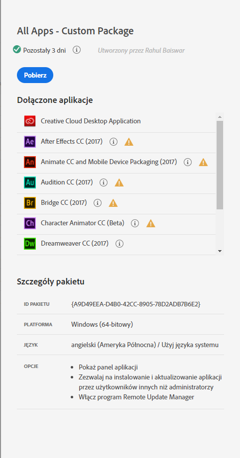 Aby wyświetlić dodatkowe informacje o poszczególnych nieaktualnych aplikacjach w pakiecie, umieść wskaźnik myszy nad symbolem ostrzeżenia wyświetlanym na prawo od nazwy aplikacji.