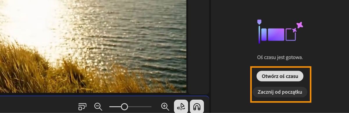 Jeśli oś czasu jest pusta, dane wyjściowe są do niej automatycznie dodawane. Jeśli oś czasu już zawiera zawartość, wybierz Otwórz oś czasu , aby otworzyć wygenerowany szybki montaż w nowym oknie, lub wybierz Zacznij od nowa , aby ponownie uruchomić proces.