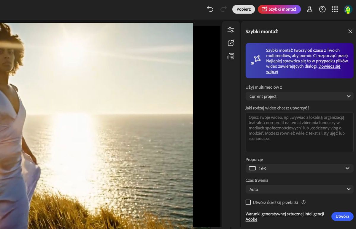 Funkcja Szybki montaż w edytorze wideo Firefly (beta) pomaga szybko połączyć klipy wideo, obrazy i pliki audio w spójny wstępny montaż. Łącząc przesłane multimedia z pomocą sztucznej inteligencji, możesz stworzyć wstępny układ wideo gotowy do dopracowania i edycji.