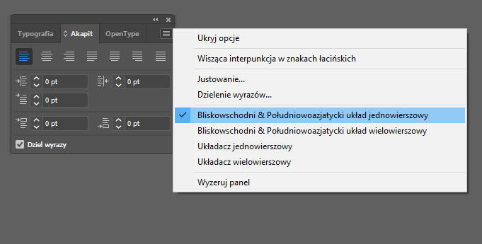 - W wersjach chińskiej, japońskiej i koreańskiej programu Illustrator kierunek tekstu, typy cyfr, automatyczne wstawianie Kashida i znaki diakrytyczne nie są dostępne.