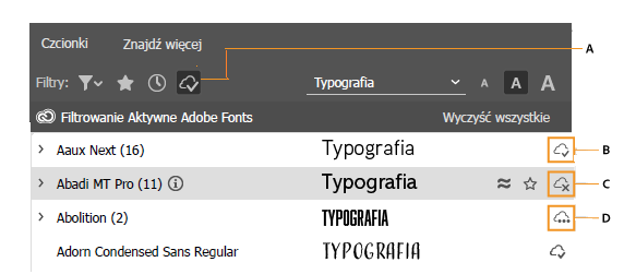Filtruj czcionki dodane z Adobe Fonts |