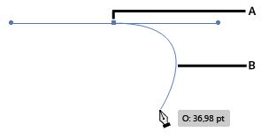 A. Pierwszy punkt kontrolny i jego uchwyty B. Podgląd Elastyczne pasmo dla ścieżki pomiędzy pierwszym punktem kontrolnym a kursorem myszy