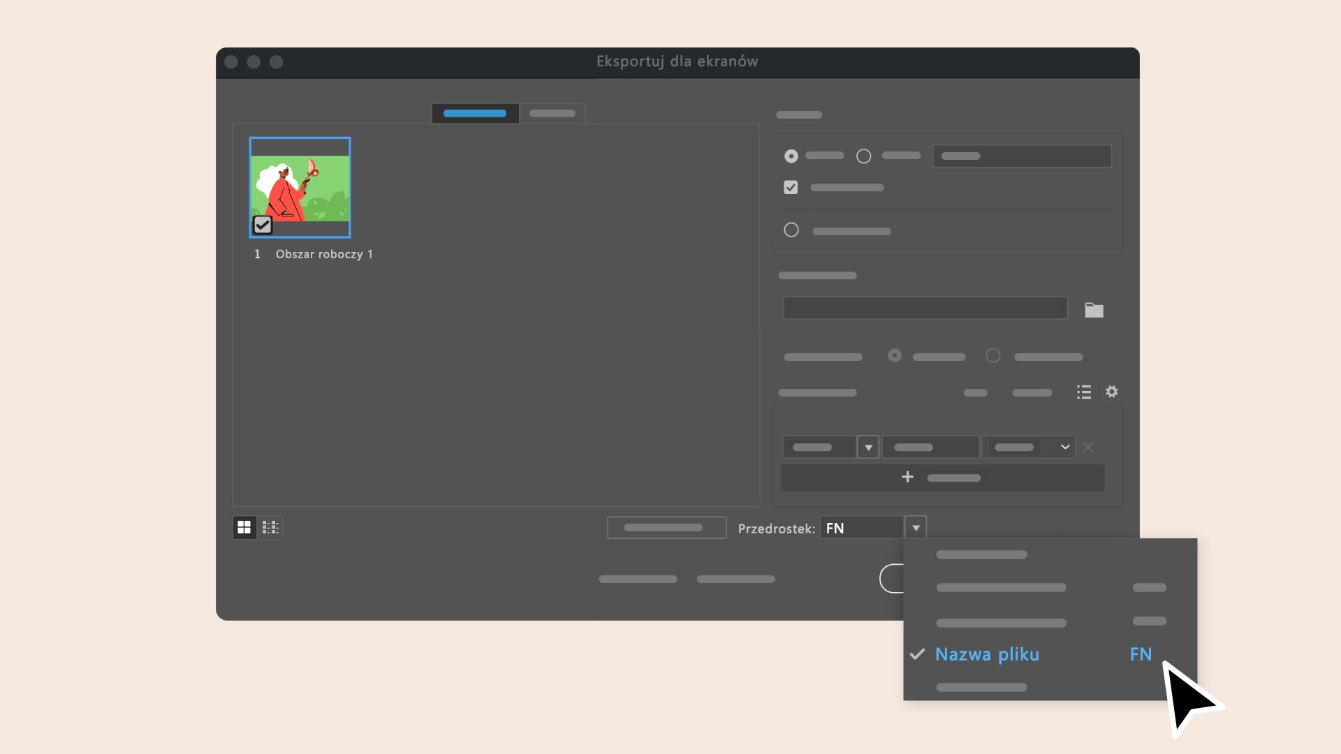 Nazwę pliku można dodać jako prefiks podczas eksportowania obszarów kompozycji lub zasobów za pomocą funkcji Eksportuj do wyświetlania na ekranach, co pozwala na ich późniejszą łatwą identyfikację.