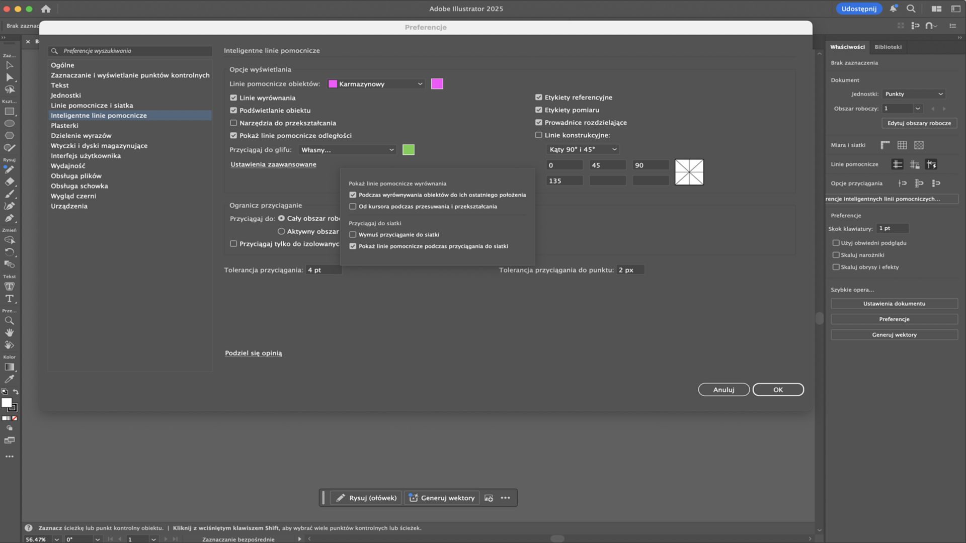 Użyj nowych ustawień zaawansowanych w inteligentnych liniach pomocniczych, aby dostosować sposób wyrównywania i przyciągania obiektów na obszarze roboczym. Wybierz, czy wymusić przyciąganie do siatki, dostosuj tolerancję przyciągania lub wyświetlaj linie pomocnicze podczas przyciągania, aby przyciąganie płynnie dostosowywało się do Twojej pracy.