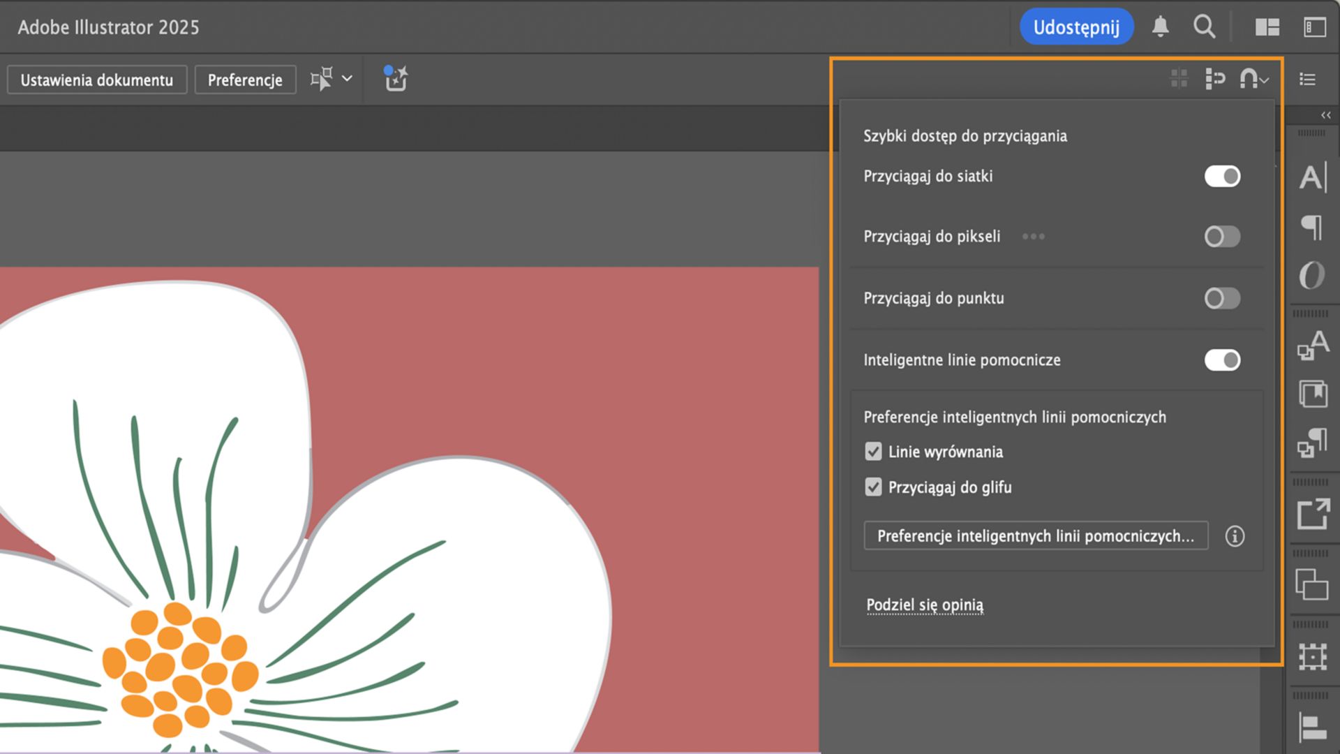 Przyciąganie w programie Illustrator jest teraz bardziej responsywne, elastyczne i dokładne. Dzięki inteligentniejszym liniom pomocniczym, wyraźniejszym wskazówkom wizualnym i konfigurowalnym ustawieniom przyciągania można wyrównywać kształty dokładnie tam, gdzie jest to potrzebne — niezależnie od tego, czy przyciąganie dotyczy siatek, obróconych obiektów czy innych elementów.