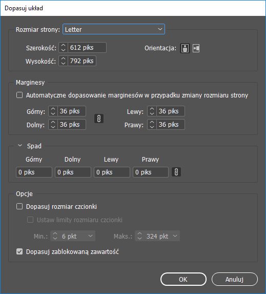 Ustaw następujące opcje w oknie dialogowym Dopasuj układ: