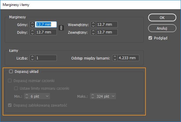 W oknie dialogowym Marginesy i łamy wybierz opcję Dopasuj układ. Domyślnie to pole wyboru nie jest zaznaczone.