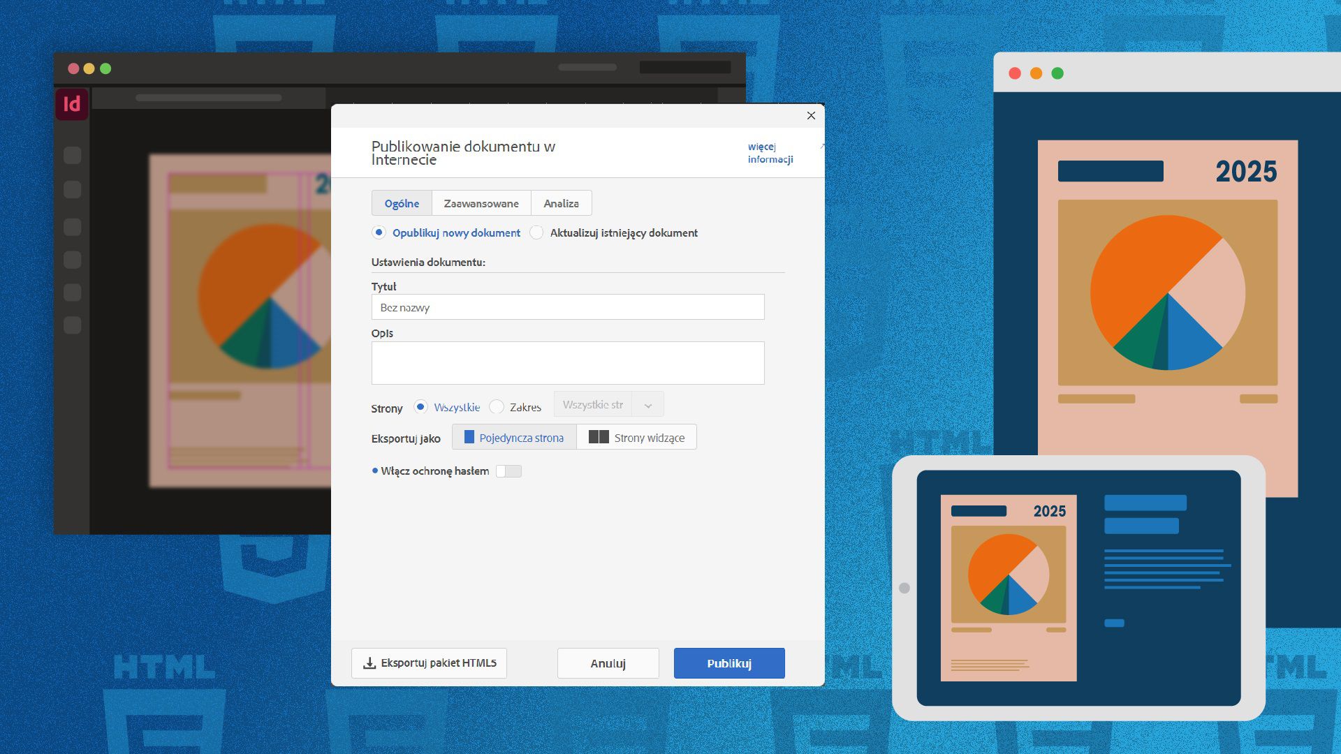 Eksportowanie dokumentów InDesign jako pakietu HTML5 ułatwia hostowanie ich w witrynie lub na serwerze, co pomaga poprawić SEO i dostępność. Tekst można wyeksportować jako tekst HTML lub znaczniki SVG.
