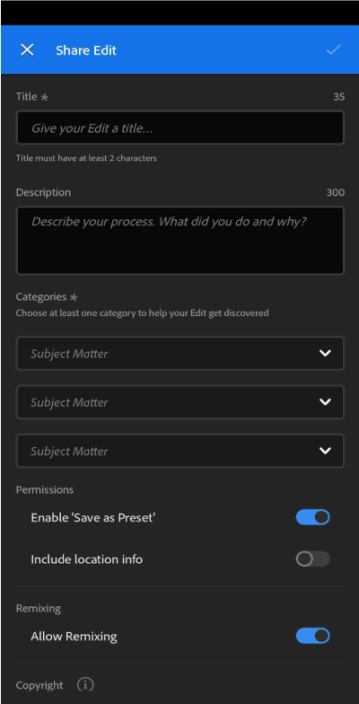 Po zakończeniu edycji zdjęcia dotknij ikony (). Dodaj komentarz dotyczący procesu edycji, a następnie dotknij przycisku Opublikuj, aby użytkownik mógł zobaczyć Twoje zmiany. Wszystkie dokonane zmiany zostaną wyświetlone na karcie Remiksy w profilu użytkownika.