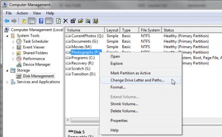 6. Kliknij prawym przyciskiem myszy dysk używany do przechowywania zdjęć, który ma mieć statyczną literę dysku, i wybierz polecenie Właściwości.