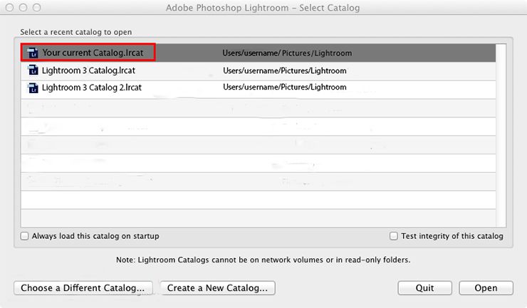 Podczas uruchamiania programu Lightroom Classic po zresetowaniu preferencji może pojawić się monit o uaktualnienie katalogu. Wykonaj poniższe kroki, aby odzyskać swój prawidłowy katalog.
