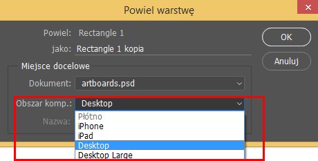 W przypadku powielania warstwy lub grupy warstw w dokumencie zawierającym obszary kompozycji można zdecydować, w którym obszarze kompozycji ma zostać umieszczona skopiowana warstwa.