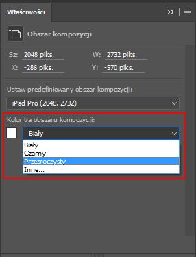 W panelu Właściwości (Okno > Właściwości) obszaru kompozycji ustaw odpowiednią wartość pola Kolor tła obszaru kompozycji. Można również ustawić tło obszaru kompozycji jako przezroczyste.