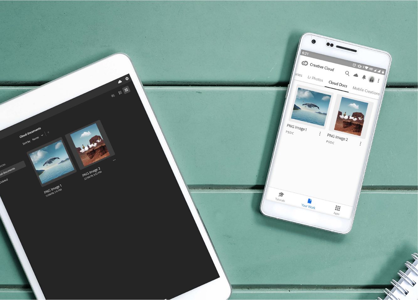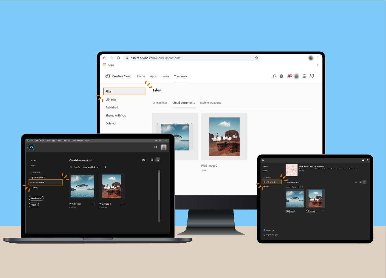 Aby korzystać z dokumentów programu Photoshop na komputerze w menu plików aplikacji Creative Cloud, należy zapisać je w tym programie jako pliki w chmurze. Dokumenty tworzone w programie Photoshop na tablecie iPad są domyślnie automatycznie zapisywane jako pliki w chmurze. Pliki w chmurze są dostępne w aplikacji mobilnej Creative Cloud.