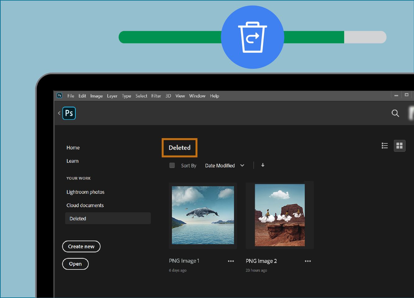 Zasoby usuwane podczas pracy w programie Photoshop pozostają w sekcji Usunięte na ekranie początkowym aplikacji. Oznacza to, że tak usunięte zasoby nadal zajmują miejsce w chmurze. Aby wyczyścić przestrzeń dyskową w chmurze, stuknij ikonę wielokropka (