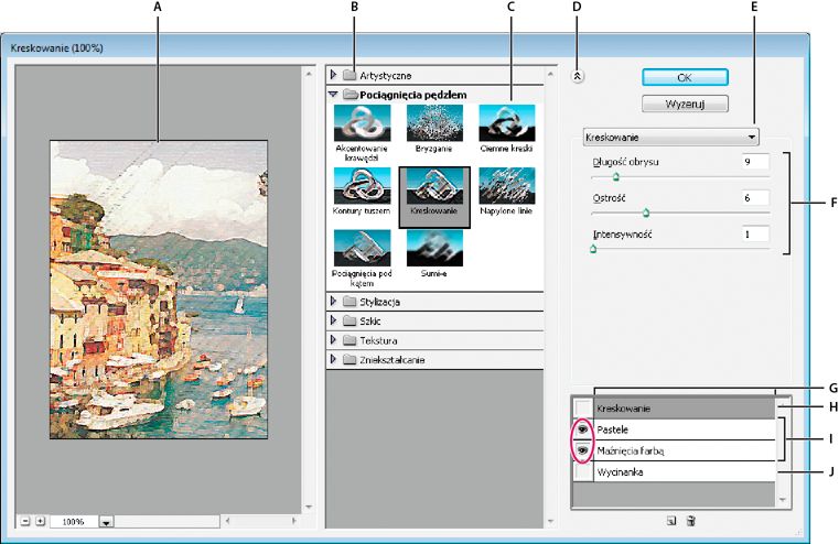 A. Podgląd B. Kategoria filtra C. Miniaturka zaznaczonego filtra D. Wyświetlanie/Ukrywanie miniaturek filtrów E. Menu podręczne Filtry F. Opcje zaznaczonego filtra G. Lista efektów filtra do zastosowania lub rozmieszczenia H. Zaznaczony, ale nie zastosowany efekt filtra I. Efekty zastosowane łącznie, ale nie zaznaczone J. Ukryty efekt filtra