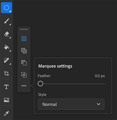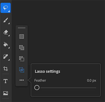 - Na pasku narzędzi stuknij dwukrotnie lub przytrzymaj ikonę narzędzia Lasso (domyślnie) lub dowolnego innego aktywnego narzędzia do zaznaczania, aby wyświetlić więcej narzędzi do zaznaczania.