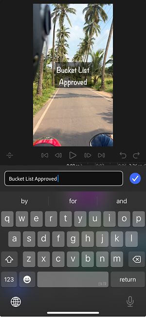 Dotknij znaku zaznaczenia w rogu okna edycji tekstu, aby dodać tekst do osi czasu.