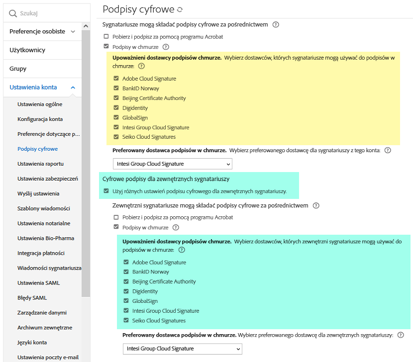 Sekcja wyróżniona na żółto poniżej określa domyślne ustawienia dostawcy podpisów w chmurze dla wszystkich sygnatariuszy. Administratorzy mają możliwość używania innego zestawu ustawień dla odbiorców zewnętrznych poprzez zaznaczenie opcji Użyj różnych ustawień podpisu cyfrowego dla zewnętrznych sygnatariuszy (poniżej wyróżniona kolorem turkusowym).