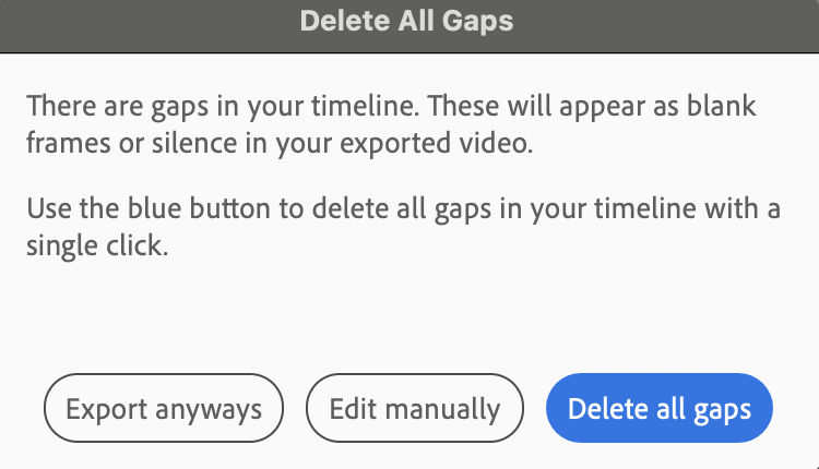 When you click Export with gaps still present in the Timeline, a warning dialog box alerts you that gaps remain in the timeline..