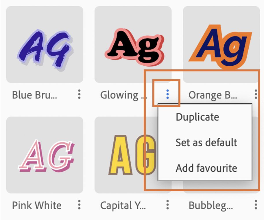 You can also select a text style to duplicate it, set it as the default, or mark it as a favorite using the three dot fly out menu in each Style Template thumbnail.
