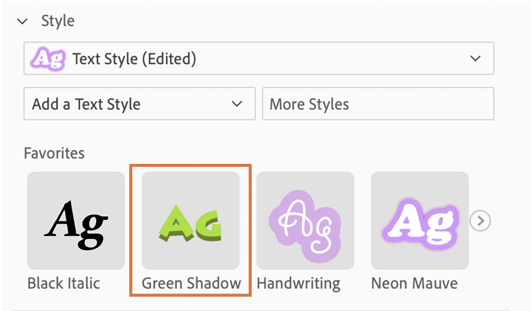 - Selecting Add Favourite marks the text style as a favorite, making it easily accessible under the Favourites category, as well as in Style Templates and My Styles within the More Styles icon.