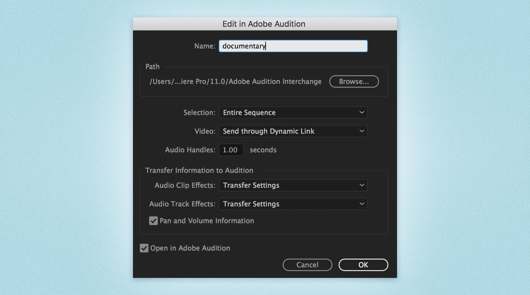 Name and Path of the Project generated (defaults to the sequence name which will be send to Audition).