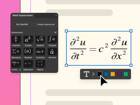 Create and style mathematical expressions and scientific notations in InDesign documents with an integrated math editor. Customize the look to align with standards for research and technical publications.