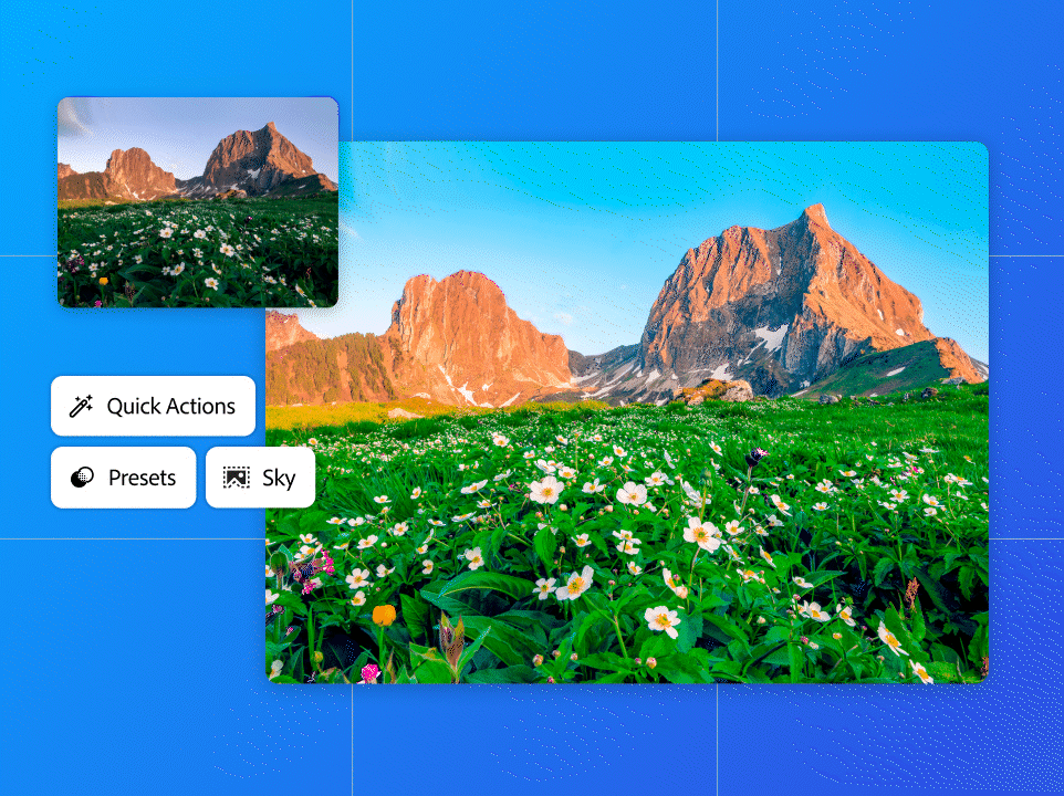 With updated Quick Actions in Lightroom, you can do even more advanced edits with a tap. Apply a specific look, isolate backgrounds, amp up the sky, and edit out blemishes in a blink.