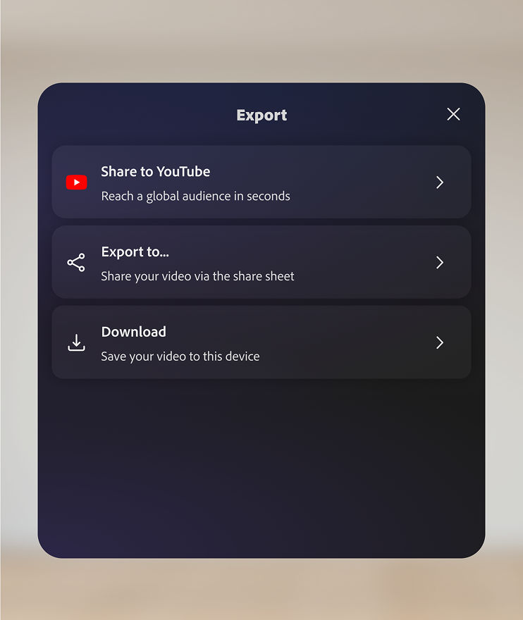 When you’re ready to export your project, simply tap the Export button at the top right of the Timeline window to open the Export panel.