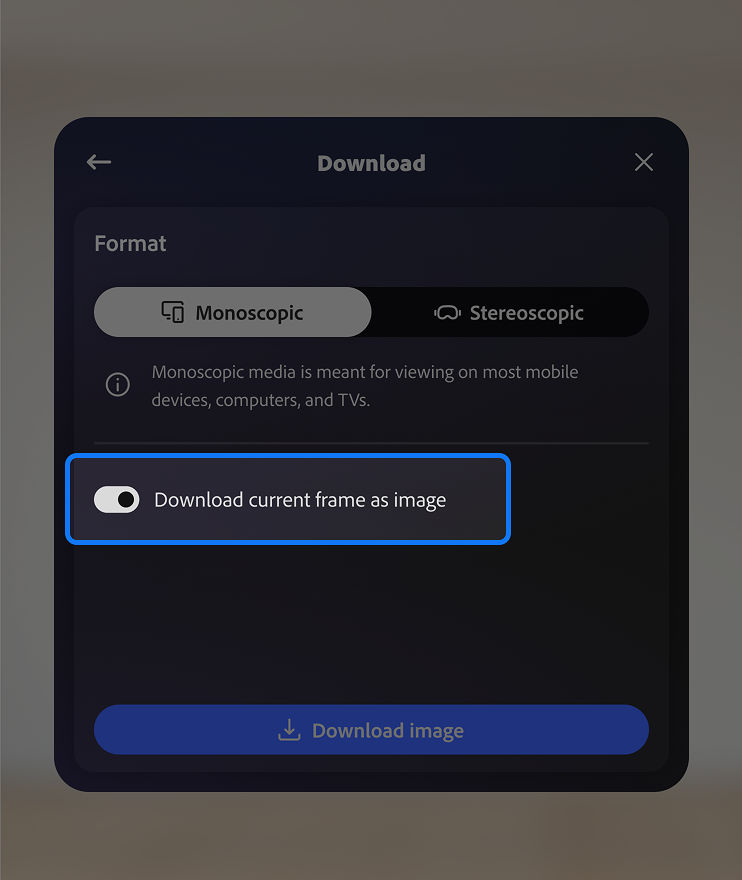 If you want to export the current frame as an image, toggle ‘Download current frame as image’ on. When this is enabled, a monoscopic or stereoscopic image will be saved instead of a video.
