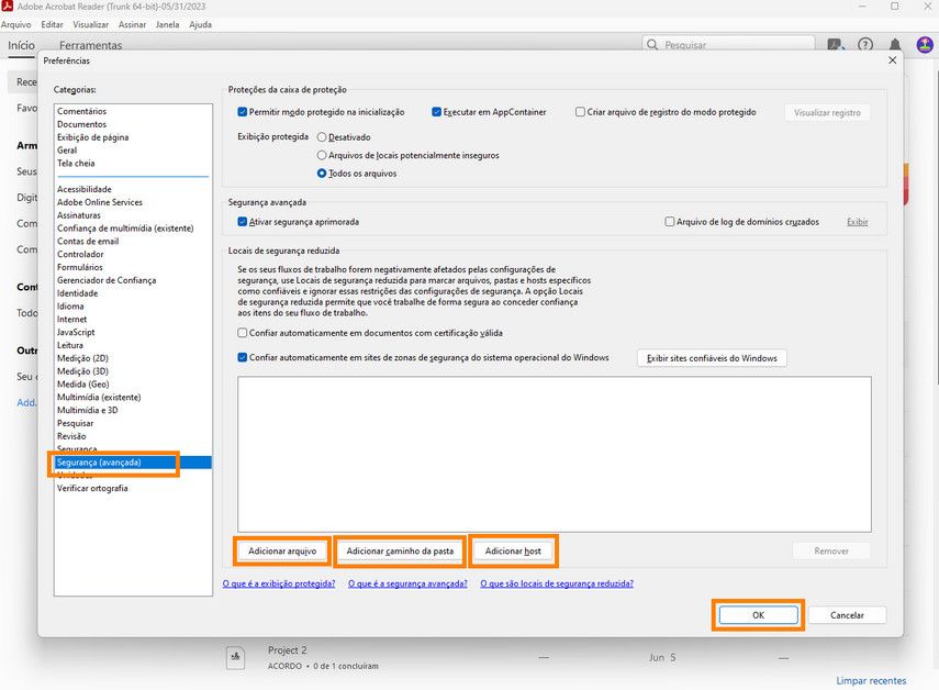 Adicionar arquivos, pastas e hosts como Locais privilegiados: em Preferências, use a barra lateral esquerda para acessar Segurança (aprimorada) e adicione seus arquivos, pastas e hosts como Locais privilegiados. Após a adição, clique em OK.